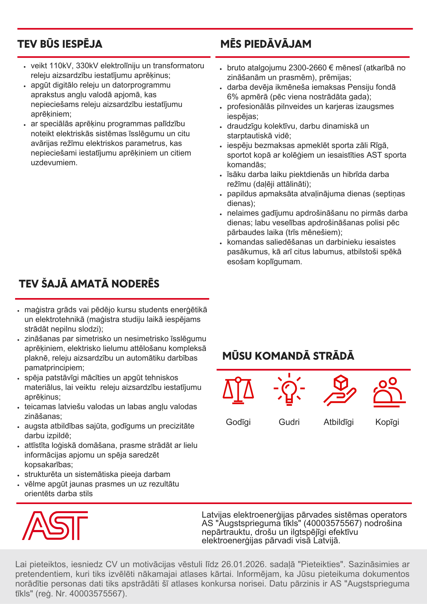 Nāc strādāt ar Latvijas elektroenerģijas mugurkaulu! Veiksi releju aizsardzību aprēķinus 110kV un 330kV tīklam, modelēsi avārijas režīmus un attīstīsi digitālos risinājumus kritiskai infrastruktūrai.