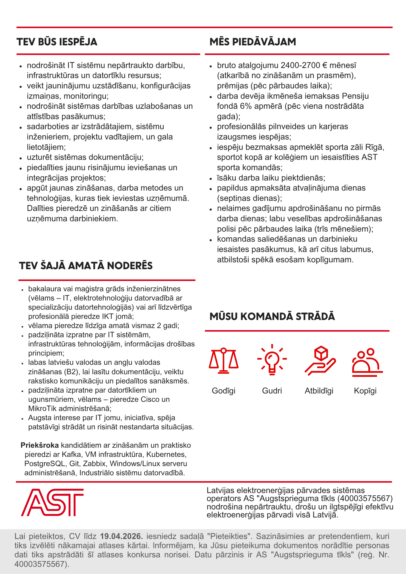 Kafka, Kubernetes, Postgres, Git, Linux – Tev šie nosaukumi nav sveši? Mēs meklējam IT profesionāli, kurš prot strādāt ar dažādām platformām, uzturēt infrastruktūru un nodrošināt tās stabilitāti.